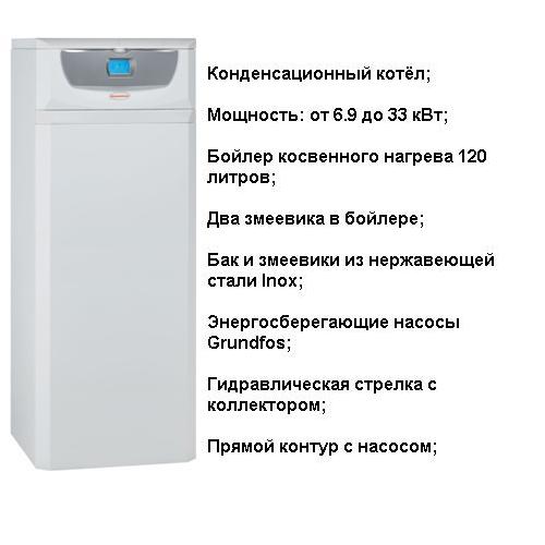 Все элементы котельной, которые включают в себя: газовый котёл, бойлер косвенного нагрева, гидравлическая стрелка, группы быстрого монтажа и вся обвязка спрятаны в одном корпусе. Размеры котла всего 1600х600х600 мм, что позволяет его разместить в любой по размеру котельной.