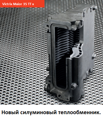 Теплообменник сделан из сплава алюминия и кремния, данный сплав обладает наилучшими свойствами для использования в отопительном оборудовании: