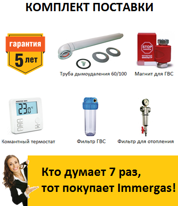 Компания Immergas думает о своём оборудовании, и заботиться о его защите от внешних факторов (плохая вода, электричество, экономия газа и тд). С этой целью компания Immergas формирует полный комплект поставки.