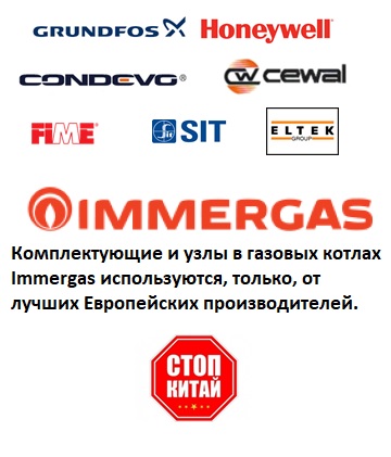Immergas уделяет внимание не только, качеству производства, но и тщательно выбирает и отбирает поставщиков самых важных узлов котла. Поэтому все комплектующие имеют не только очень высокое качество, но и имя в мире производства газовых котлов.