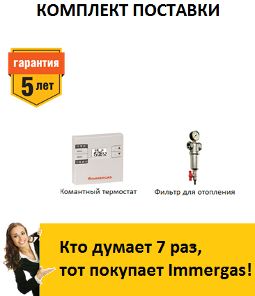 Компания Immergas думает о своём оборудовании, и заботиться о его защите от внешних факторов (плохая вода, электричество, экономия газа и тд). С этой целью компания Immergas формирует полный комплект поставки (фильтр для отопления с манометром и краном для чистки обеспечивающий идеальную защиту от накипи; – комнатный термостат, для комфортного управления котлом).